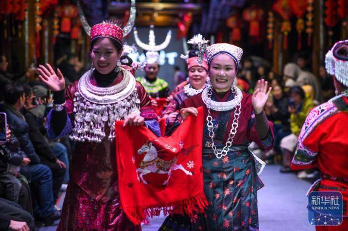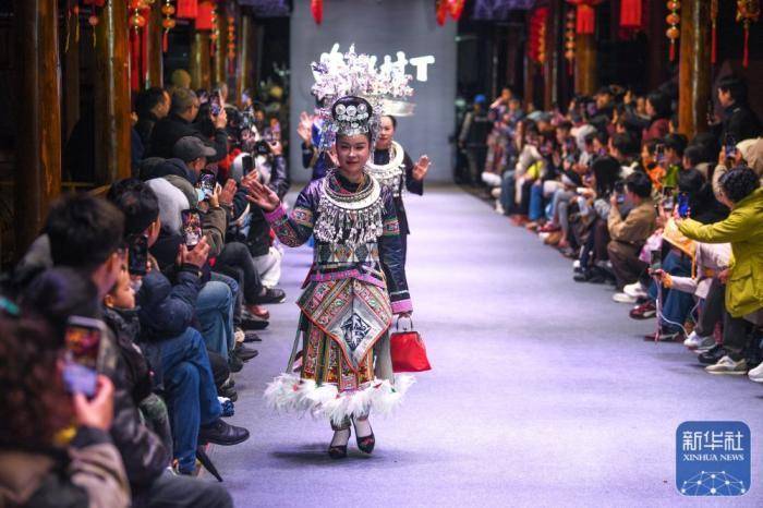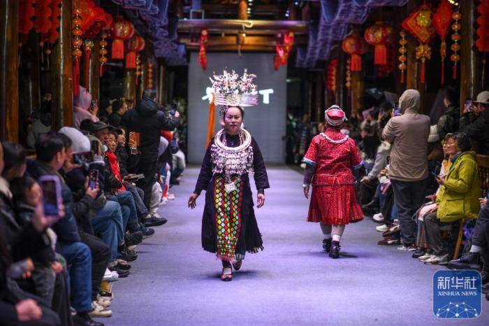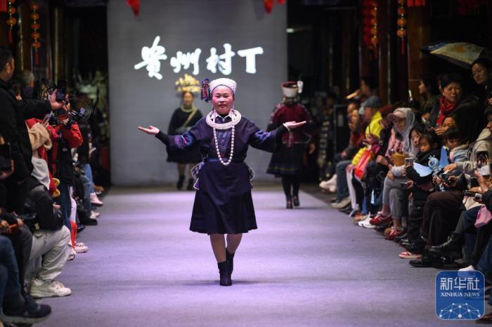 人们在贵州省凯里市苗侗风情园观看“村T”民族服饰秀。
