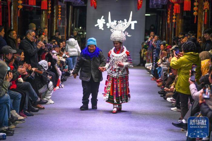 一名女孩牵着奶奶参加“村T”舞台民族服饰秀表演。